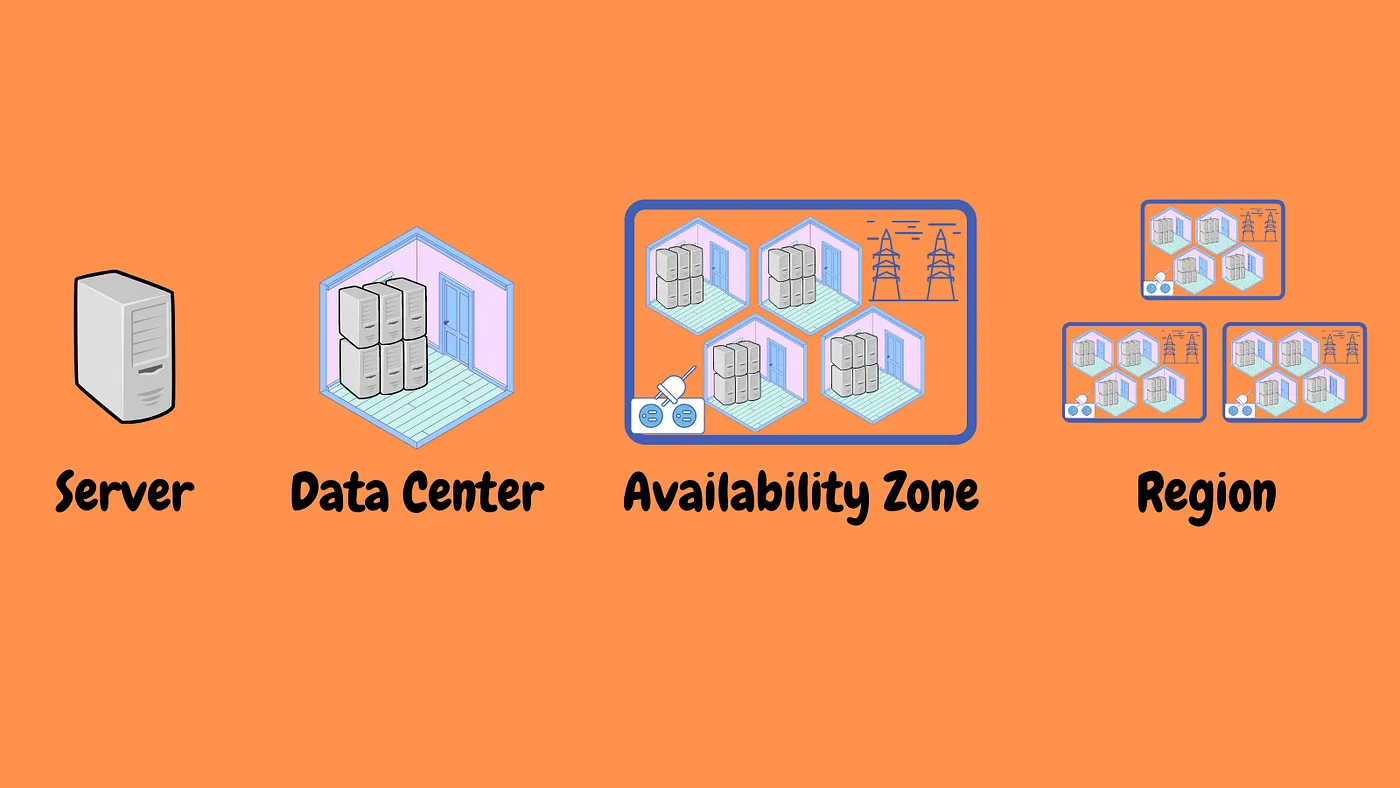 The diagram above introduces us to the four terms: Server, Datacenter, AZ, and region. I added electricity elements to emphasize that the data centers share resources.